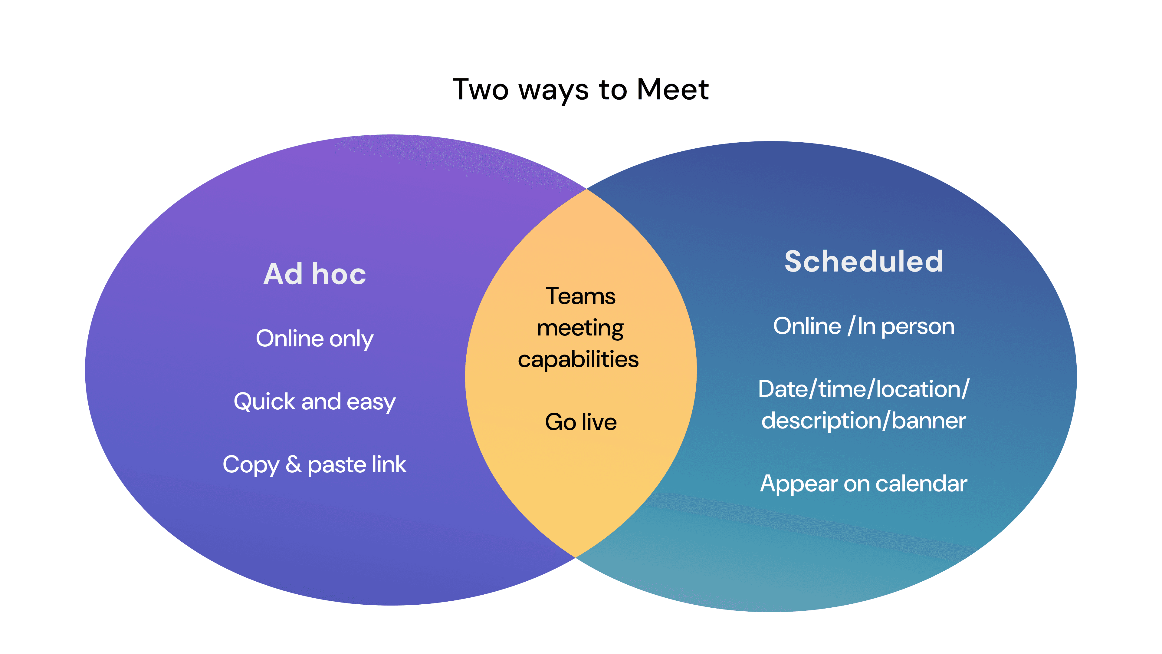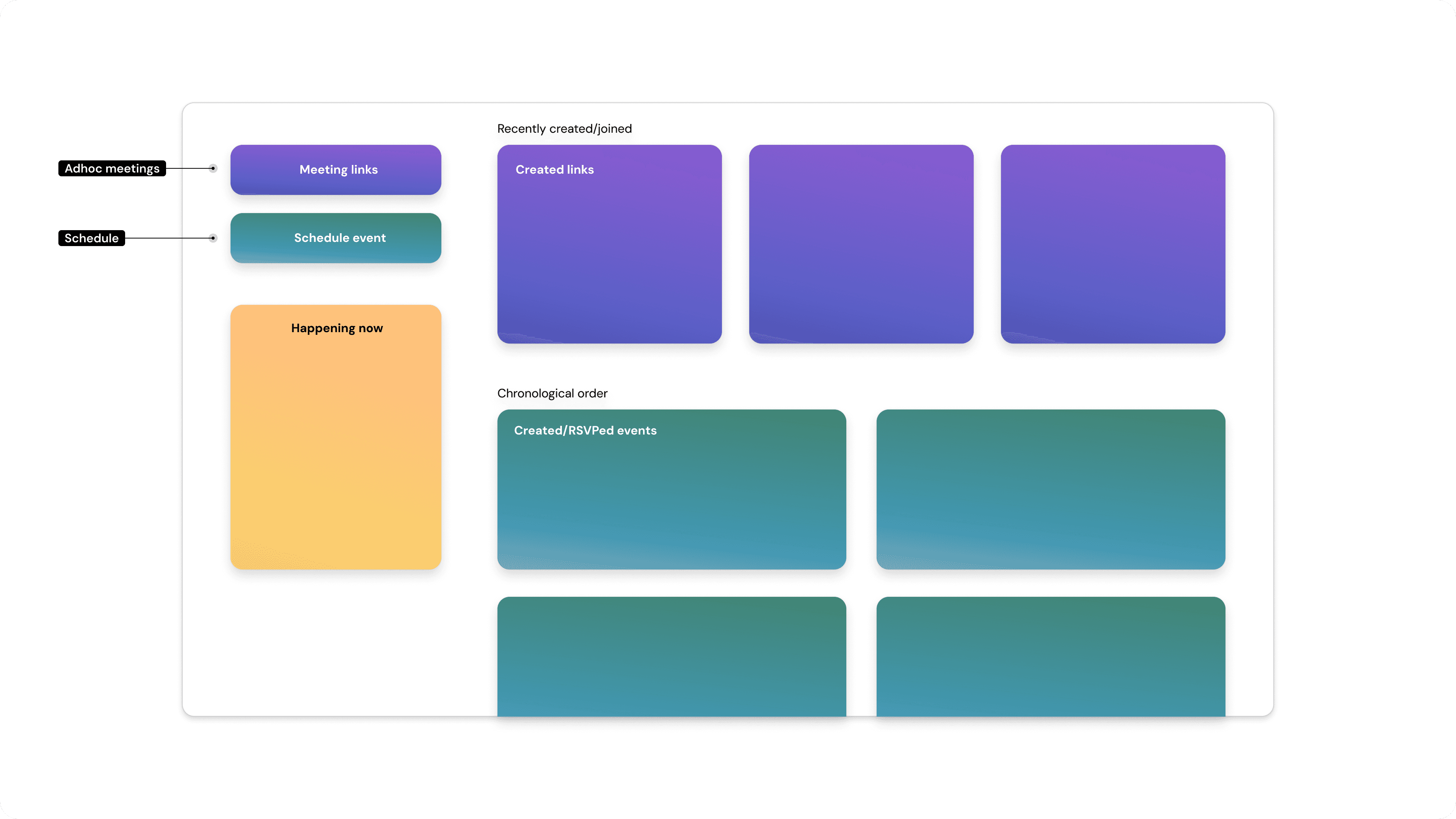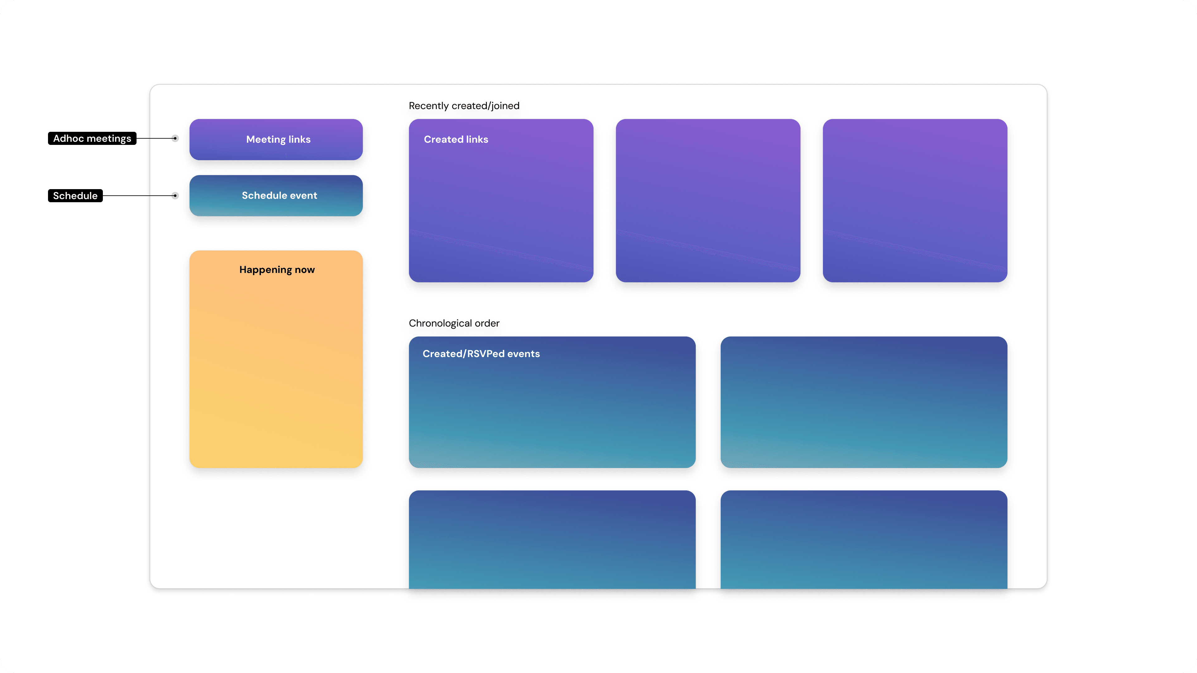 The Ad Hoc and Scheduled meetings experience was being looked at by two separate product teams each defining and working on area specific features. One was focused on building in chat and the other in calendar. I was the owner of the scheduled area and was focused on simplifying the calendar view to address the lower volume of events. Since we were working in silos, neither of the two experiences were fully capturing the core use cases.